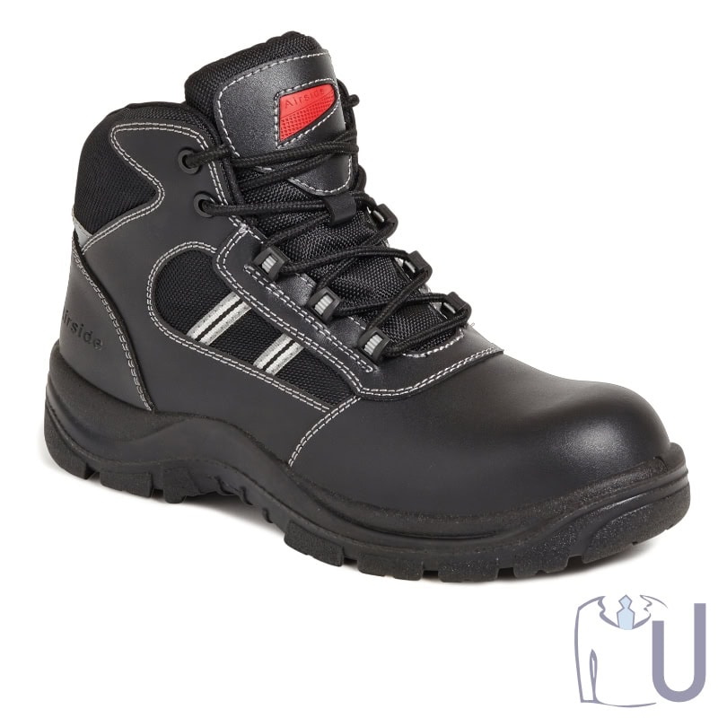 Black full grain leather water resistant safety boot. Padded collar and tongue for added comfort. Non -metallic toe cap and non- midsole protection. Dual density polyurethane outsole. Anti-static. A 100% non-metallic lightweight safety boot for all security screened work places.