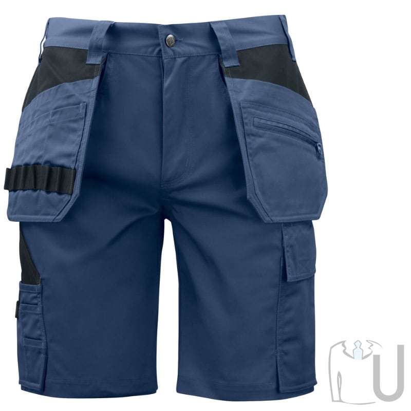 Shorts with holster pockets that can be tucked into the side pockets, one with an extra pocket and one with loops for tools. Back pockets with flap and Velcro closure. Folding rule pocket and pocket for tools with knife button. Two hammer loops, one on each side. Reinforcement inside the folding rule pocket and inside holster pockets.